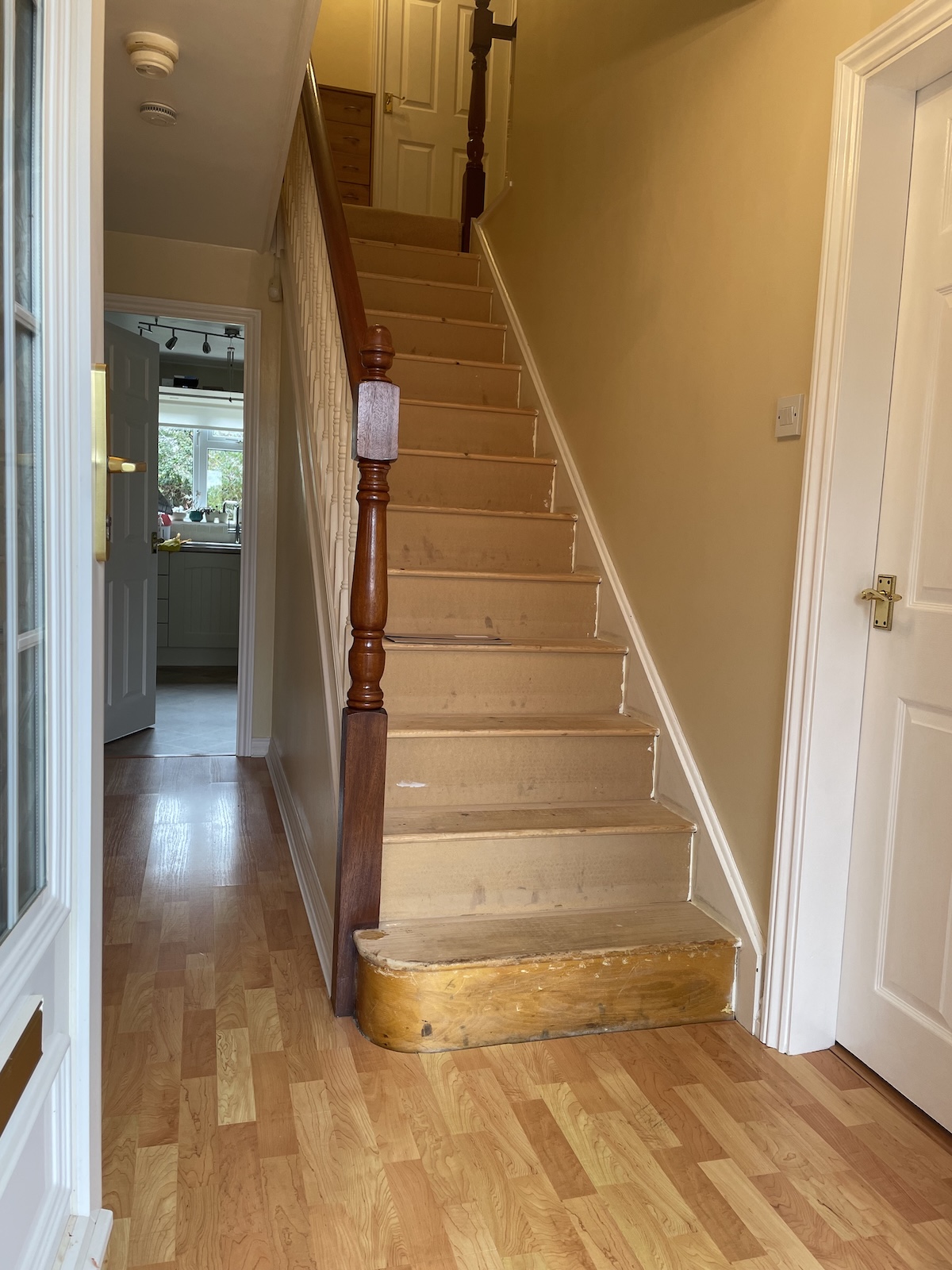 Oak Stringers: Replacing the original painted sections for a seamless, premium look.